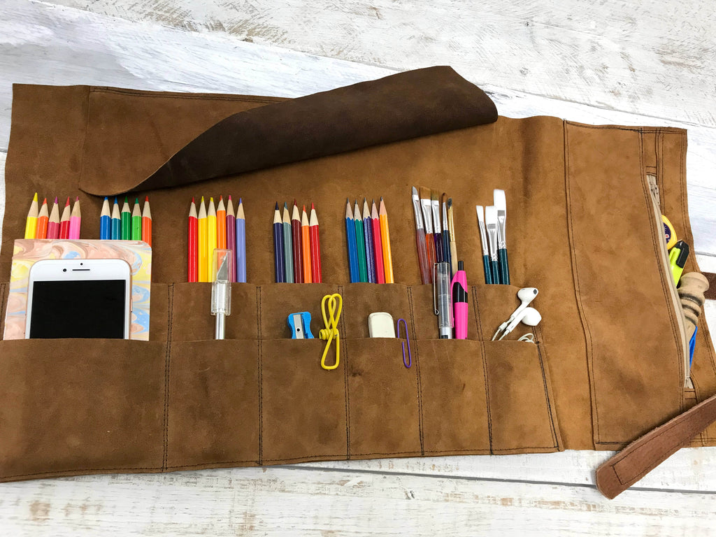 Leather Artist Roll with Zipper Pouch- Ideal as an artist's carryall. Organize your brushes, pens, notebooks, erasers, and gum in this roll up. All items in pockets are protected by a cover which prevents items from slipping out.