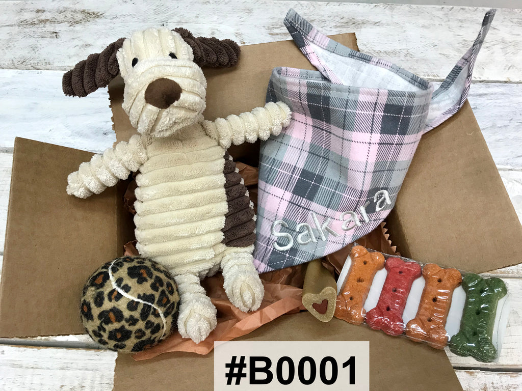 The personalized dog gift box is assembled with love and care, it's perfect for small, medium breeds.