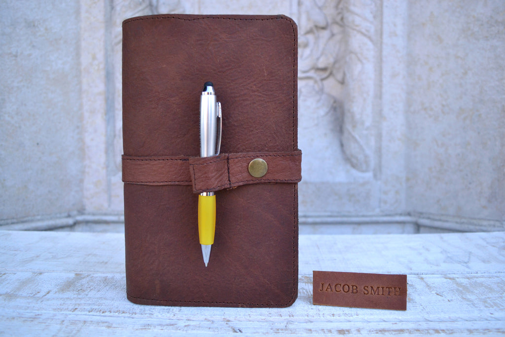 -- Soft leather cover is hand stitched. Dimension: 5.75''x9'' (when closed)