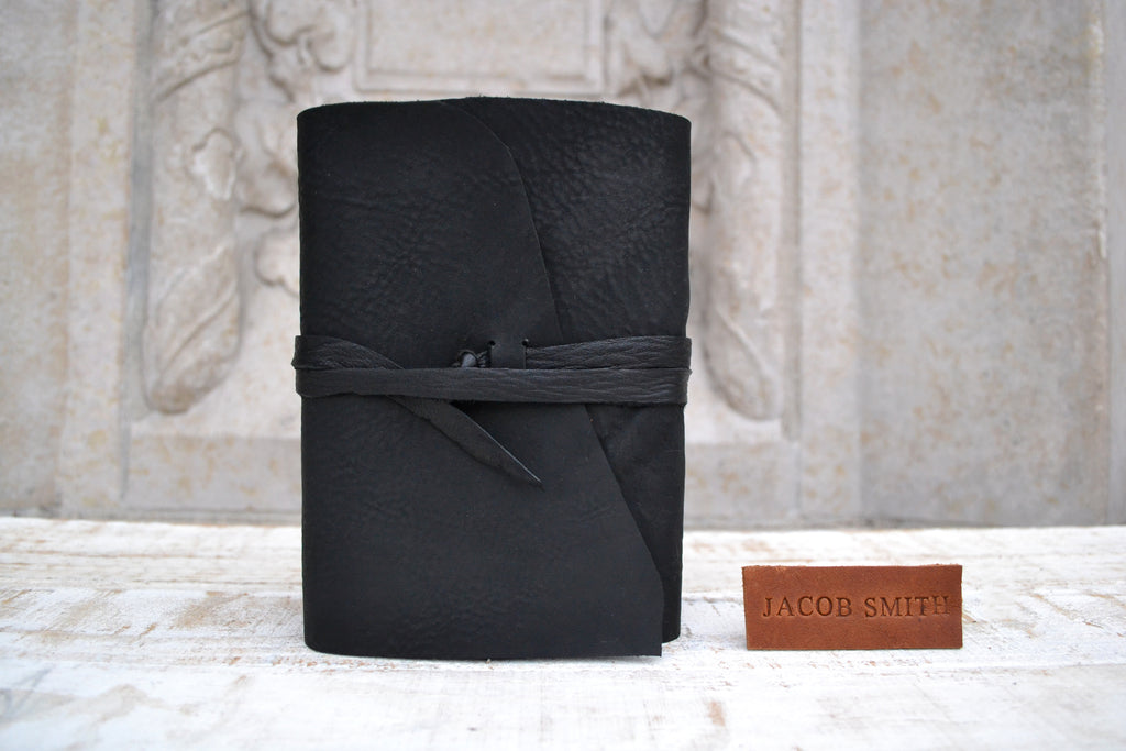 This Black leather journal includes 4 marbled notebooks. Each component is hand constructed, including the unique marbling. Notebooks are ideal for journaling, sketching, and note-taking.
