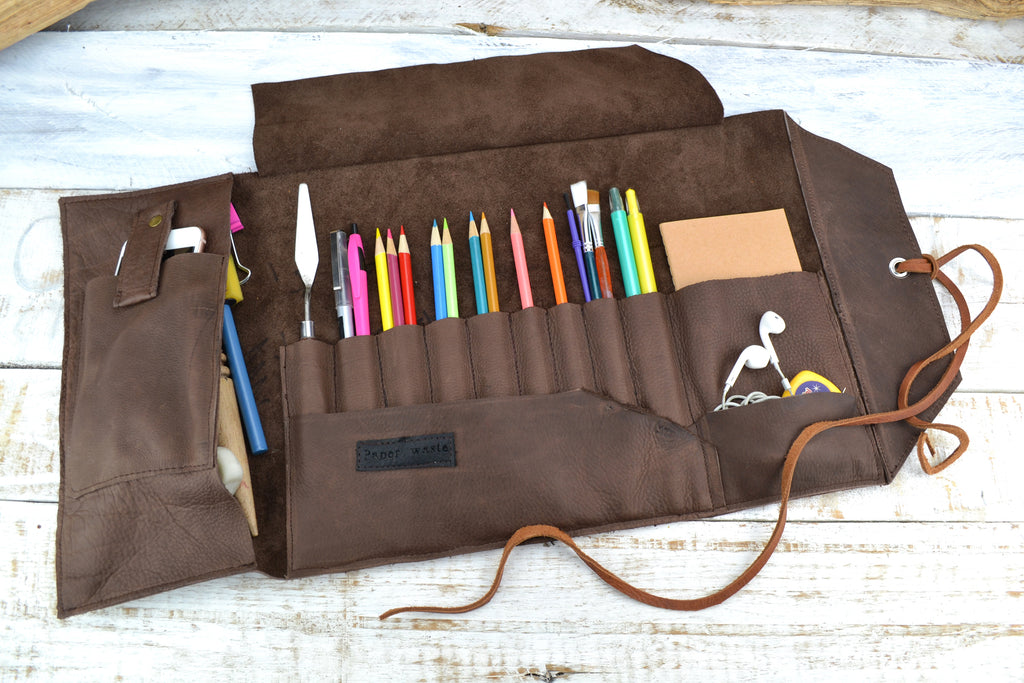 Leather Artist Roll is Ideal as an artist's carryall. Organize your brushes, pens, notebooks, erasers, and gum in this roll up. All items in pockets are protected by a cover which prevents items from slipping out.