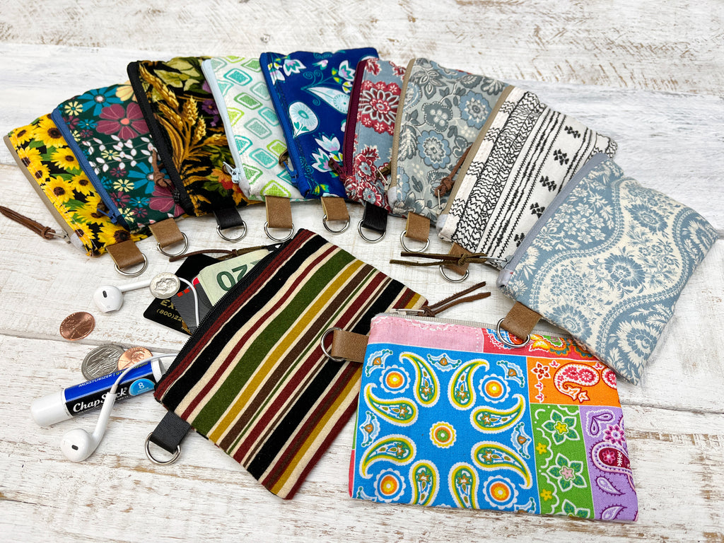 These bags are made of cotton fabric and zipper. Every bag has a leather loop and D-ring that can easily be used to hang on a hook, keychain...